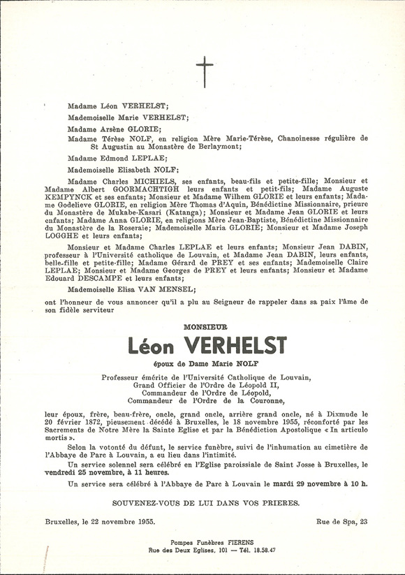 Il 18 novembre 1955, Léon Verhelst avverte la mattina di non poter partecipare alla riunione del Consiglio di Amministrazione, prevista per il giorno seguente. Non si sente bene. Verso le 15, la moglie riferisce che le sue condizioni stanno peggiorando e più tardi, Léon Verhelst muore.
